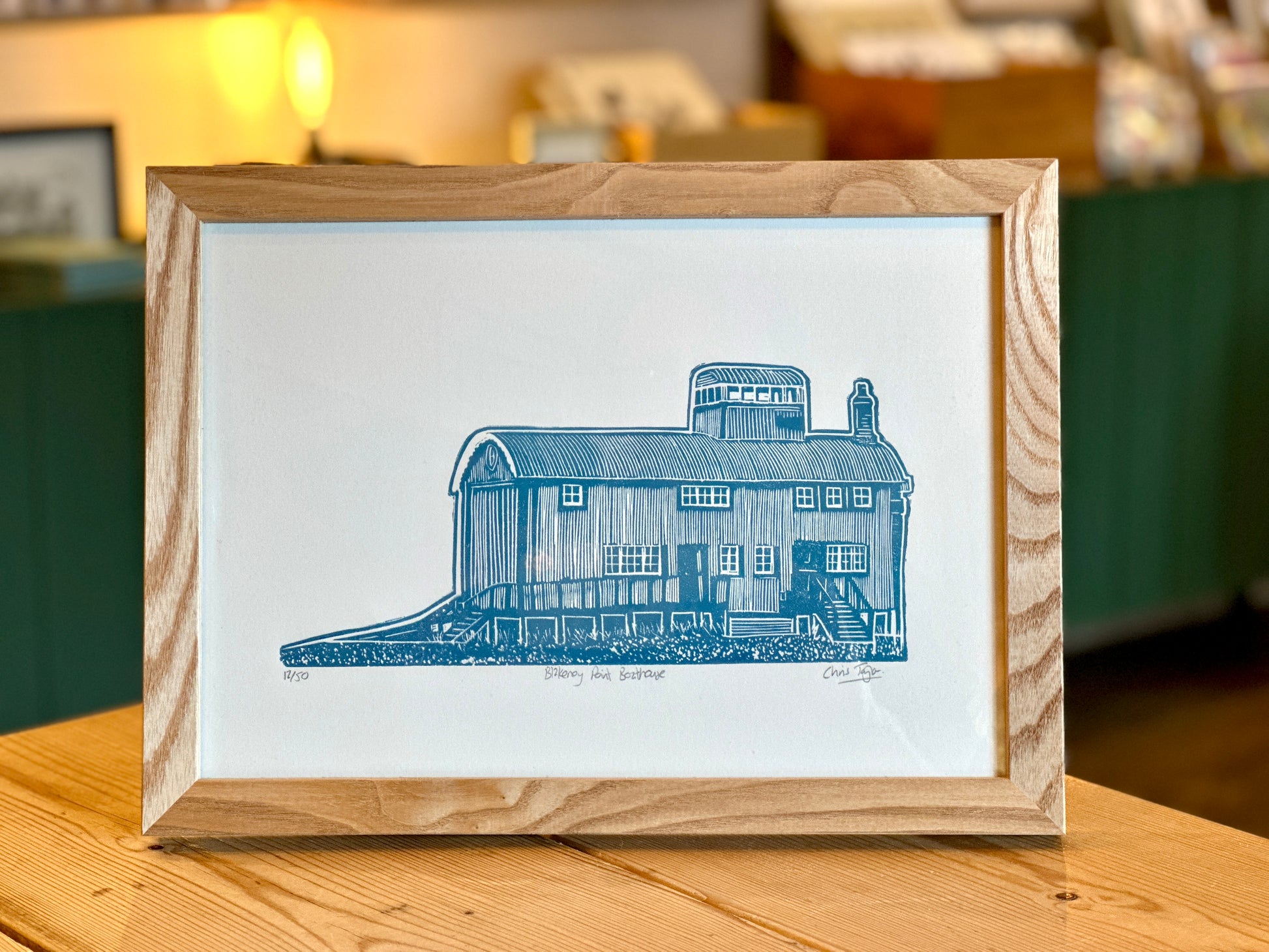 Blakeney Point Boat House Lino Print by Chris Taylor, single colour (blue) lino print