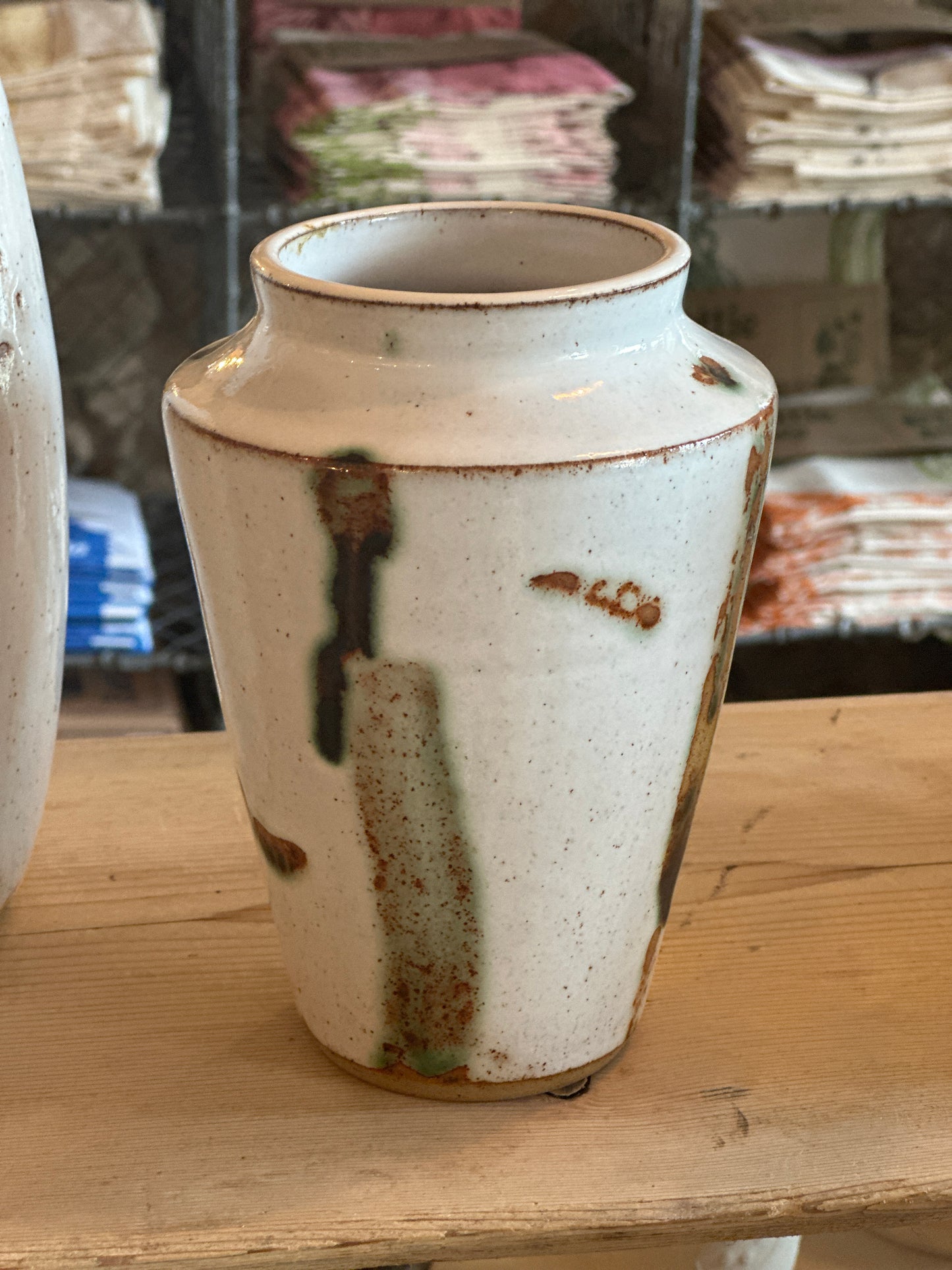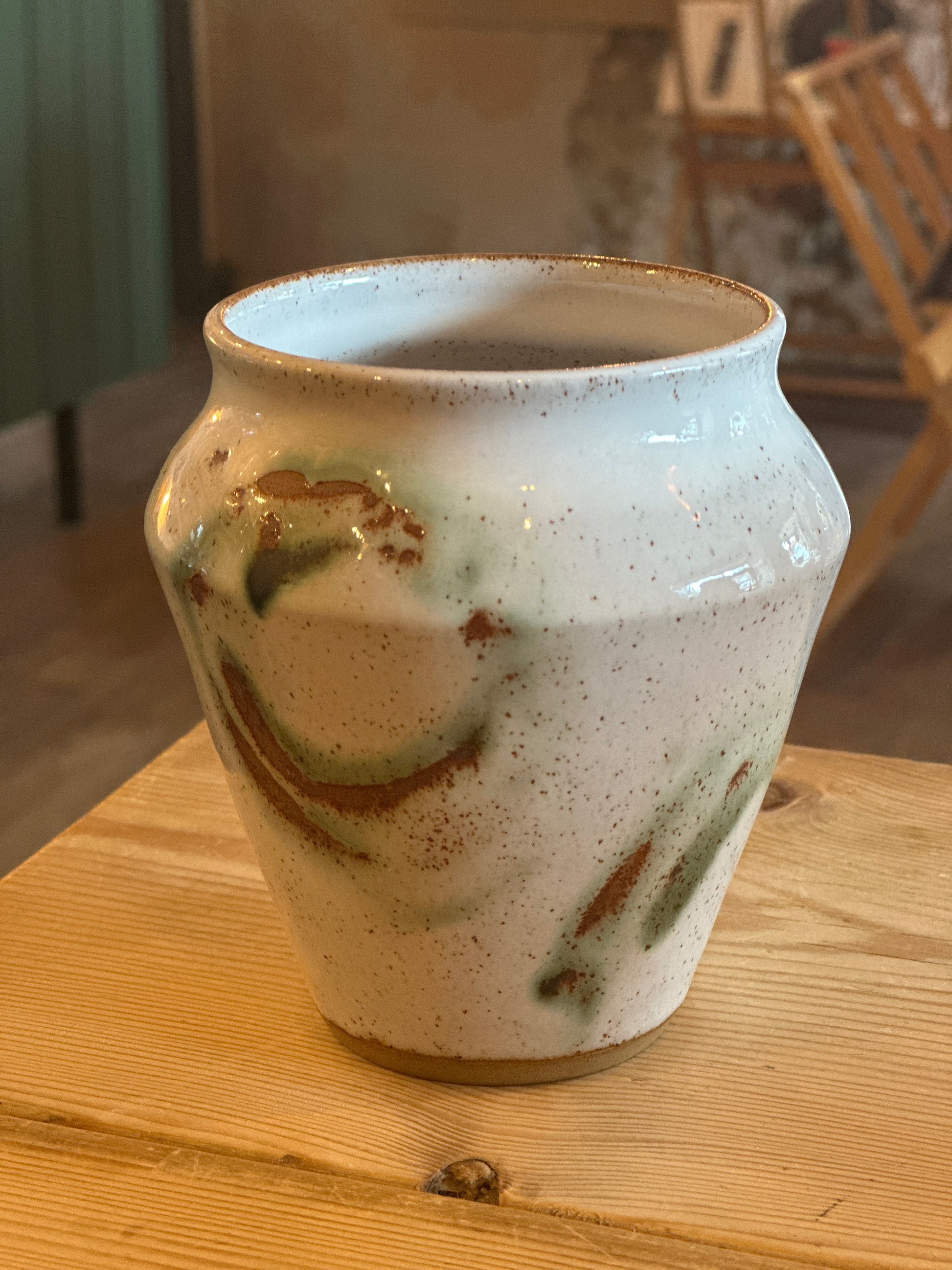 A collared vase by Sarah Horlock, with a hand decoration inspired by moss-covered earthworks emerging from the melting snow and frost on her local heath and woodlands this winter. Hand thrown in a lightly flecked stoneware clay, fired to a temperature of 1220c and finished glossy white glaze and copper oxide additions.