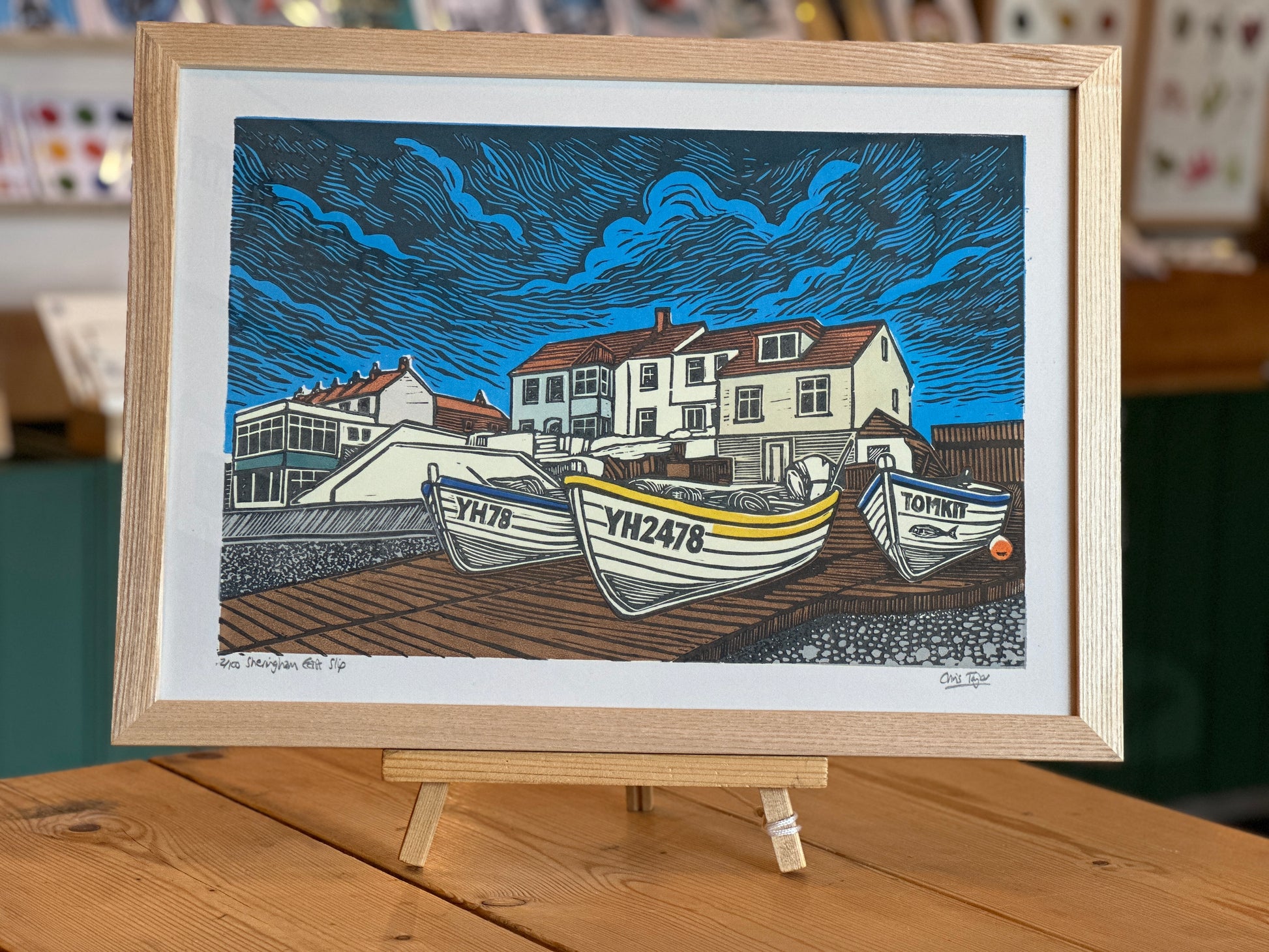 Sheringham East Slip - 15 colour linocut print by Chris Taylor, limited edition (100 made), signed.