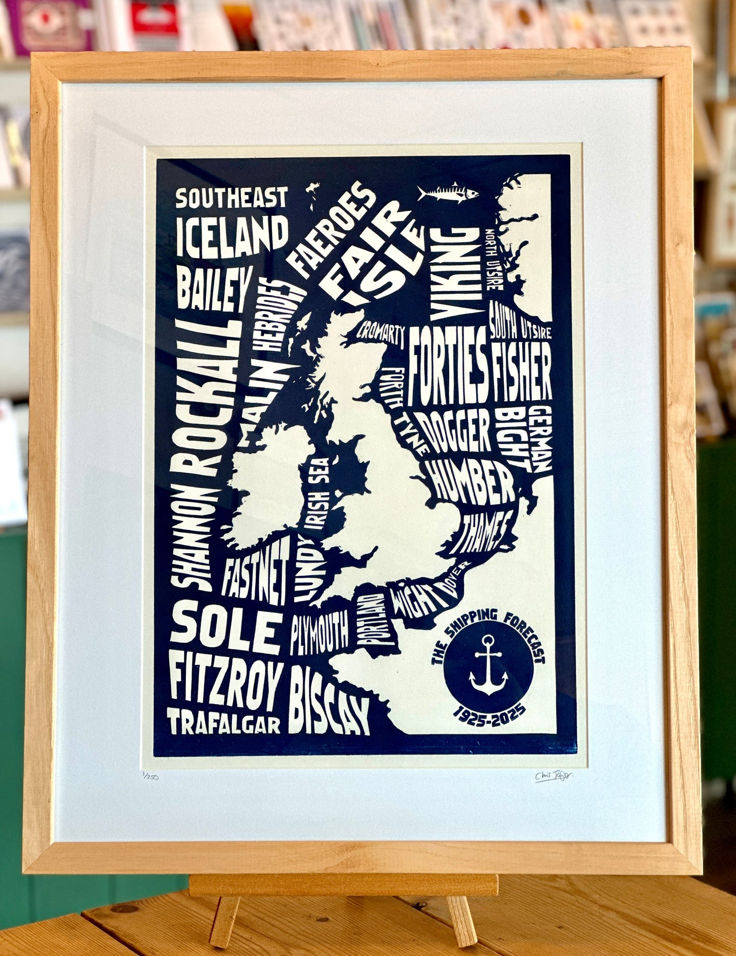 The Shipping Forecast at 100 - a linocut print by Chris Taylor, limited edition (of 250), celebrating the centenary of the much-loved Shipping Forecast showing the UK shipping areas. Printed on heavy weight printmakers' paper & in oil-based printmakers in Prussian Blue. Each one hand-signed & numbered.