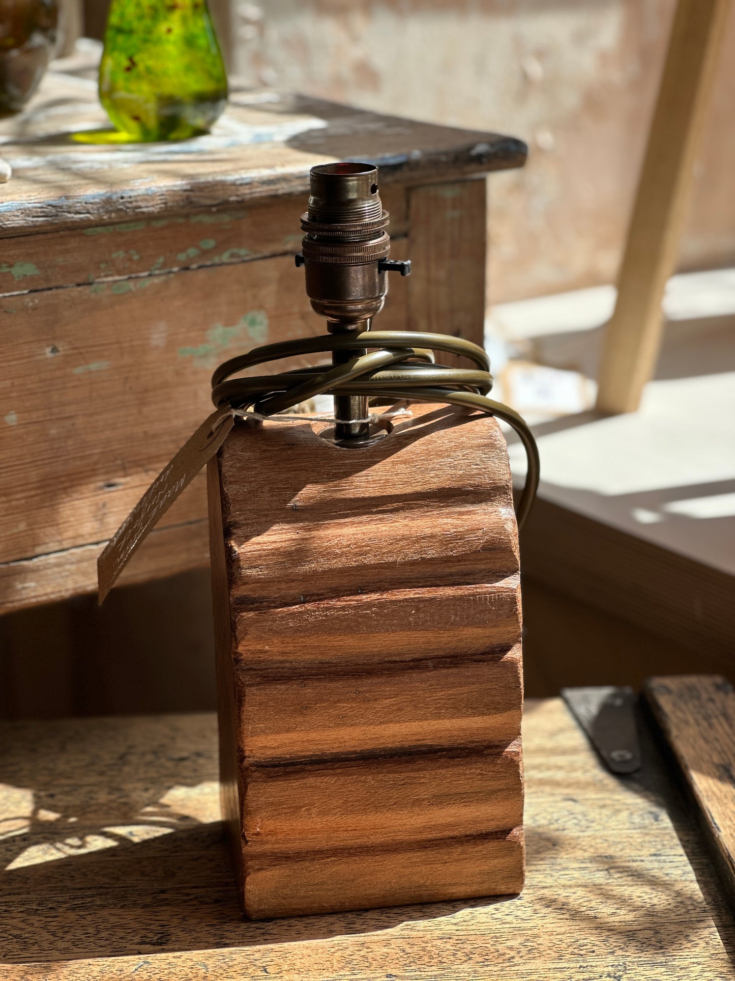 Driftwood lamp base with extended spacer and a little driftwood quay to take a lampshade.